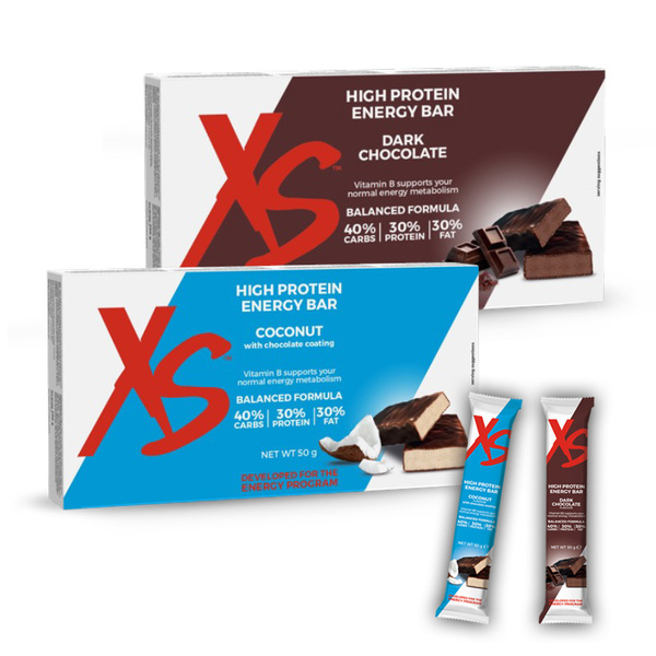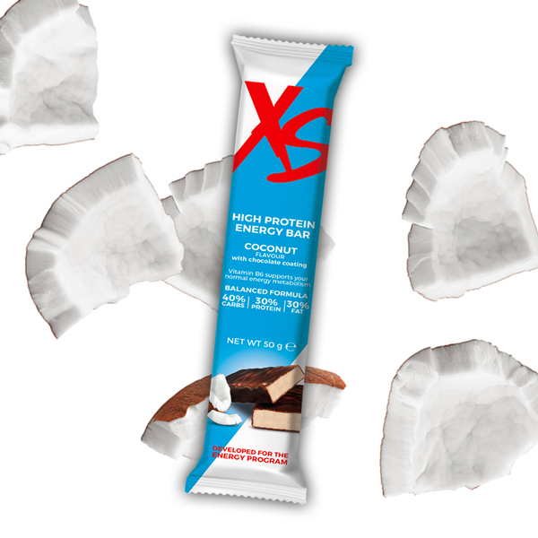 Laad uzelf weer op, waar u ook bent, met zo'n lekkere en praktische XS™ High Protein Energy Bar met kokossmaak en een evenwichtige formule in de verhouding 40-30-30.